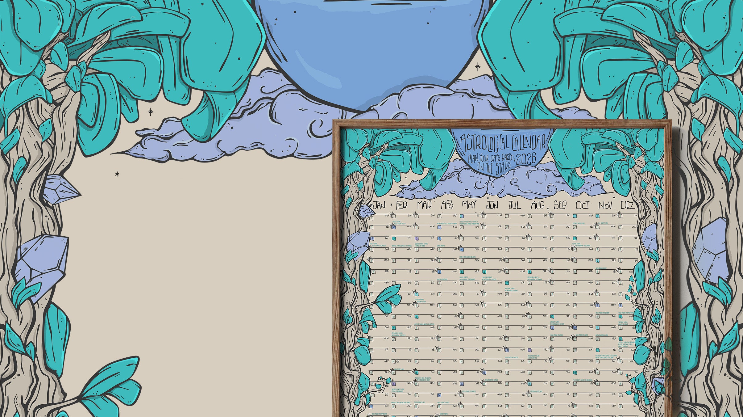 BRAND NEW DESIGN, a huge tree climbing the borders with crystals peering out the trunk, a special gift for anyone that loves astrology and needs to plan their year based on the stars