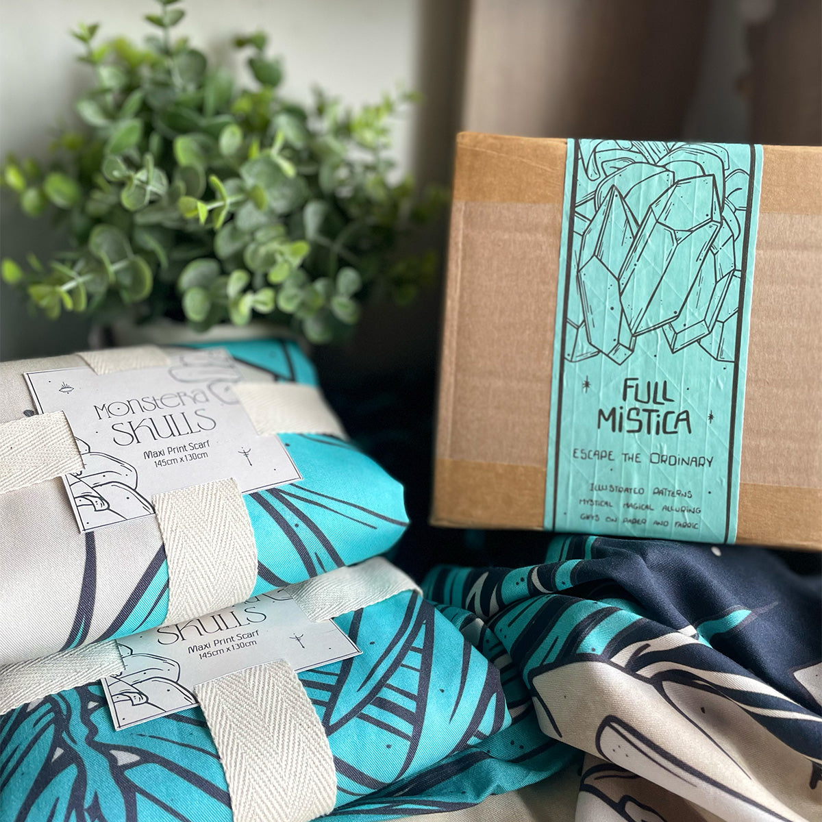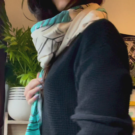 The Monstera Skulls print just got it's maxi scarf. For you to wrap around the neck in several ways, showing different parts of the illustration - showing more of the skull in cream, or more of the teal leaves, you decide, there's plenty of fabric ;)