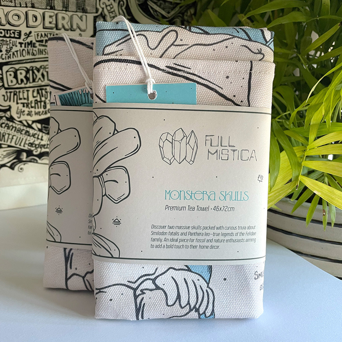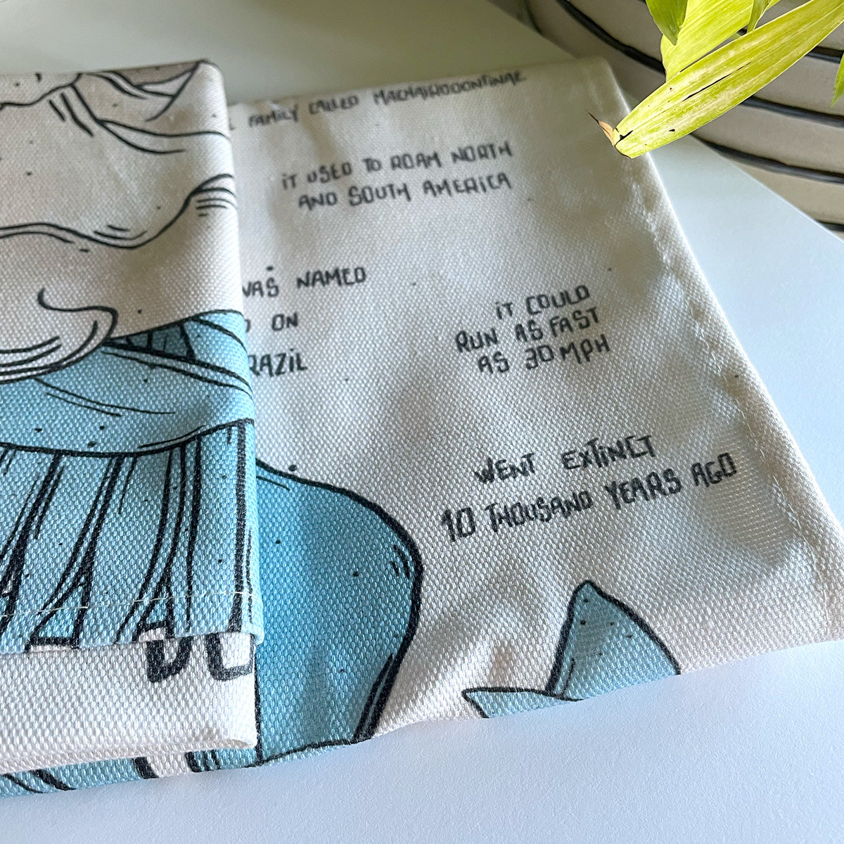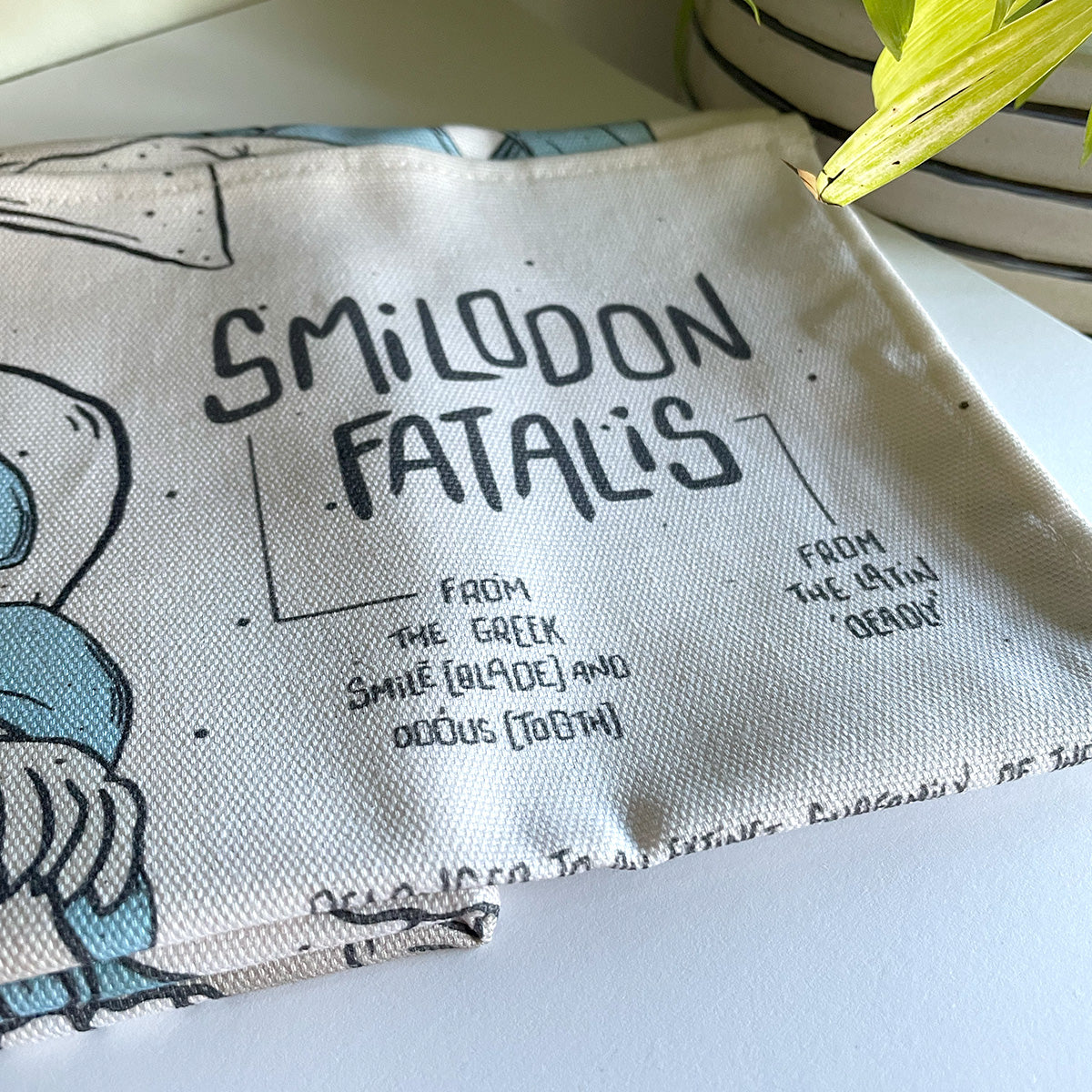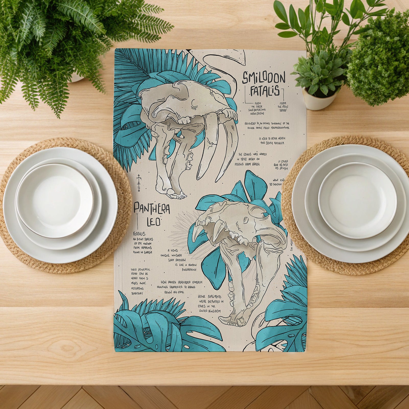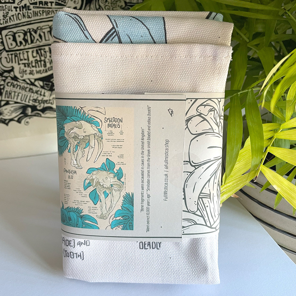 The Smilodon Fatalis and Panthera Leo tea towel offers a captivating blend of palaeontology and design. Featuring detailed illustrations of these magnificent skulls alongside intriguing historical facts, it appeals to fossil enthusiasts and trivia fans alike.