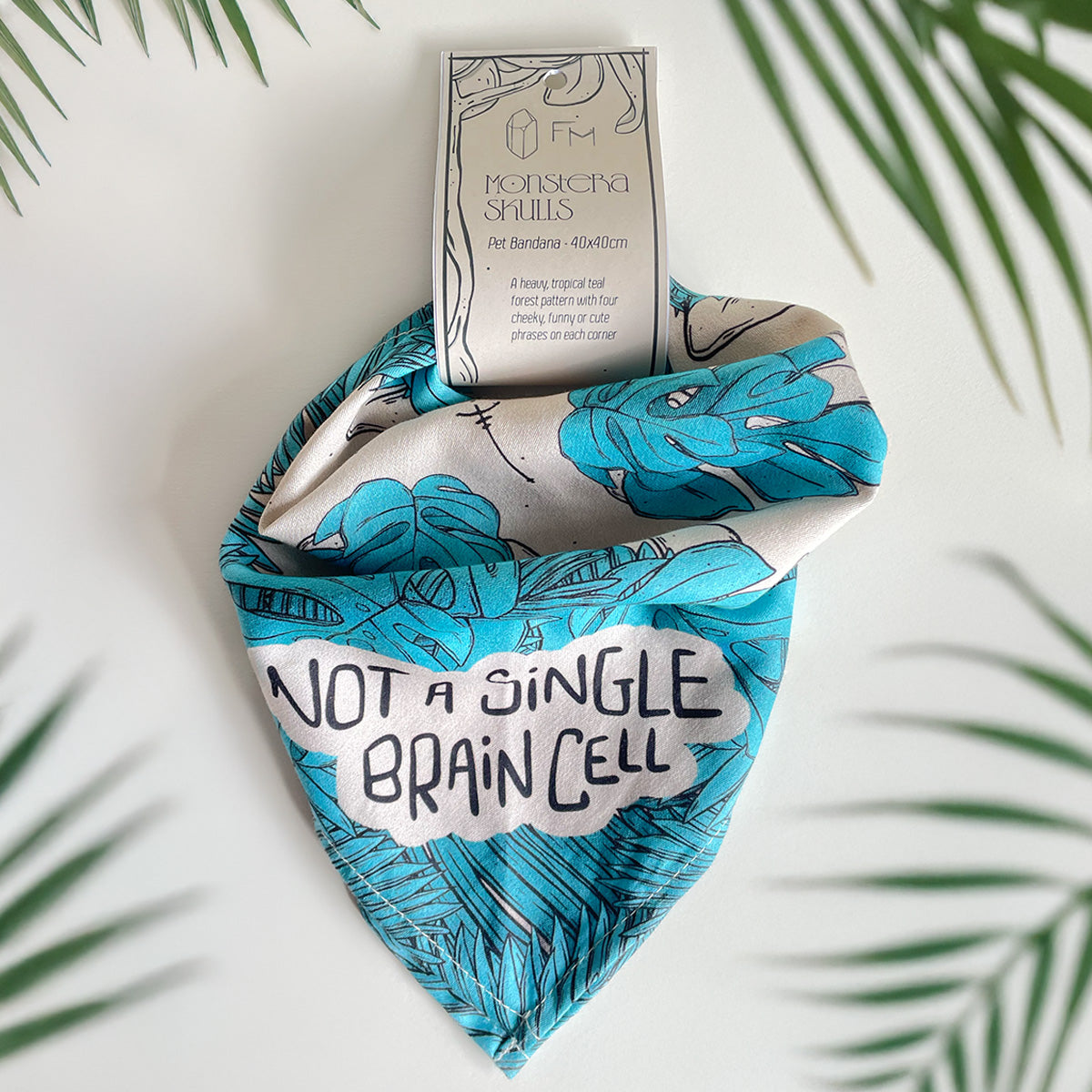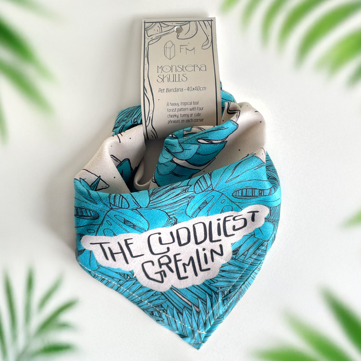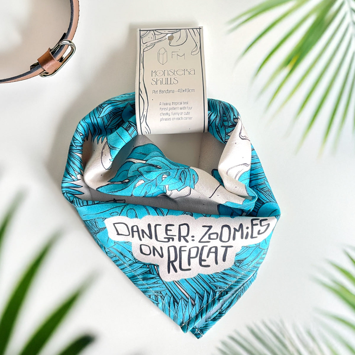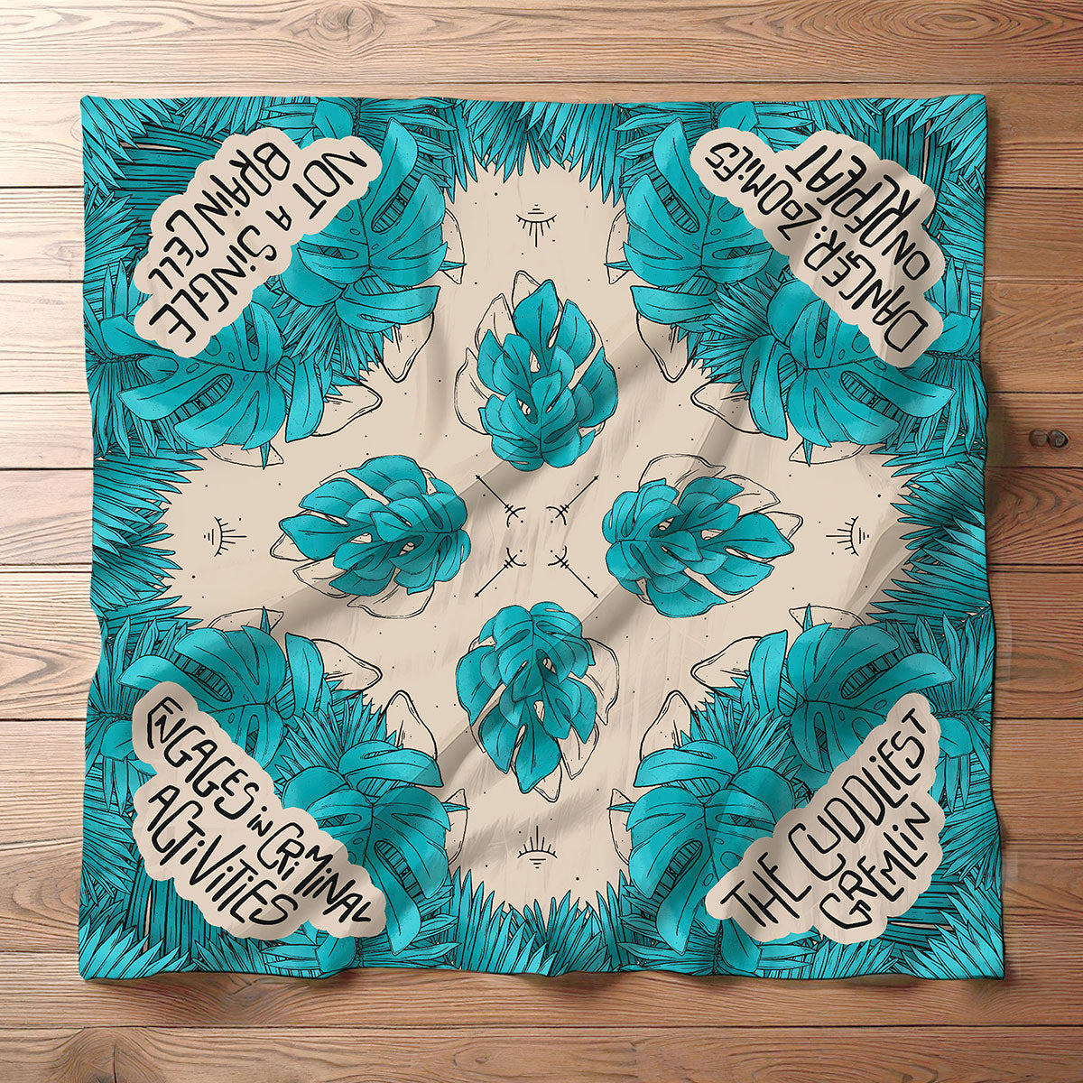 The design is filled with palm leaves and monsteras, to match with the whole collection of Monstera Skulls. Neatly arranged foliage in teal on each corner to back up the typography work, for you to choose which behaviour matches with your pet for that particular day: