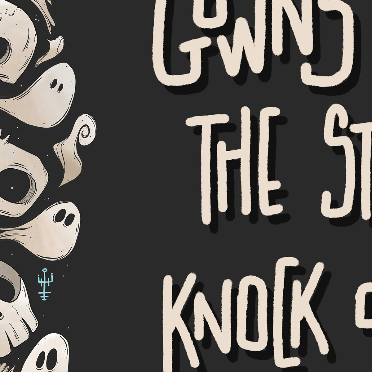 A hand drawn typography print to decorate your space for the spooky season. Tall, long letters fitting into one another with a nice brush texture, referencing a quote from the poem "It's Halloween!" by Jack Prelutsky: